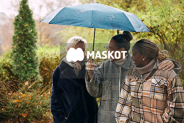 Glada kvinnliga vänner går i regnet under paraply