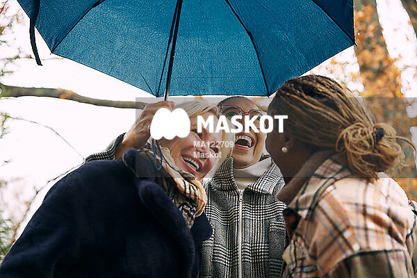 Glada kvinnliga vänner står under paraply i regnet