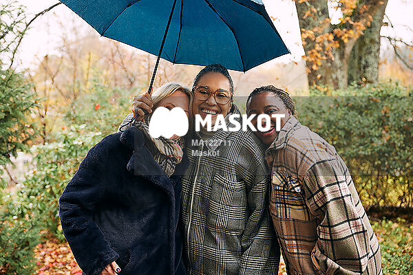 Porträtt av glada kvinnor som står under paraply