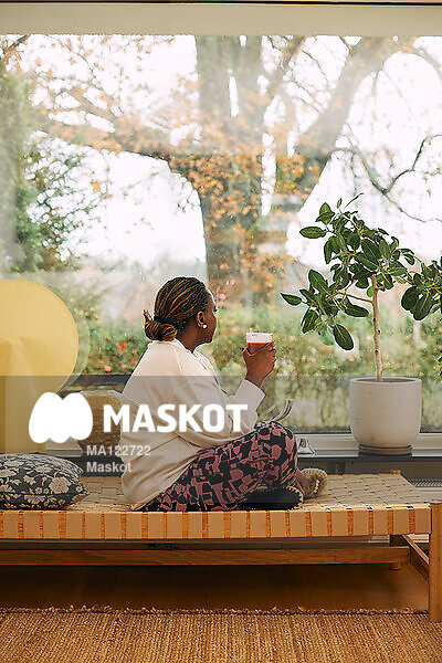 Kvinna håller i proteindrink och kollar ut genom fönster