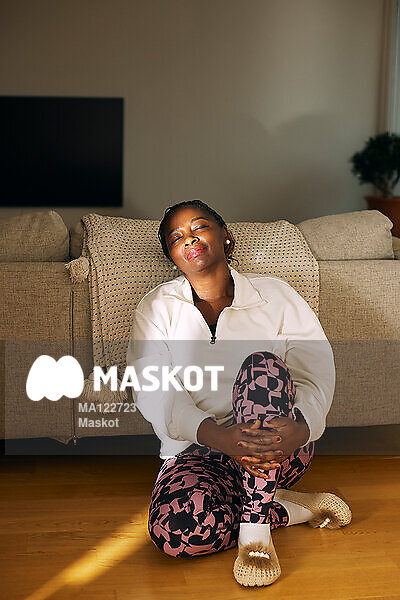 Kvinna sitter och blundar i vardagsrum