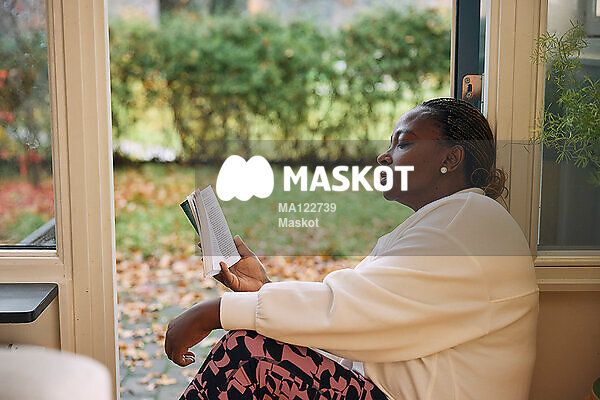 Kvinna läser bok vid fönster