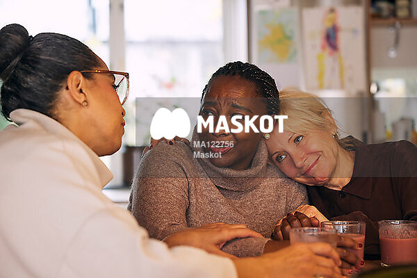 Äldre kvinna kramar vän under fikastund
