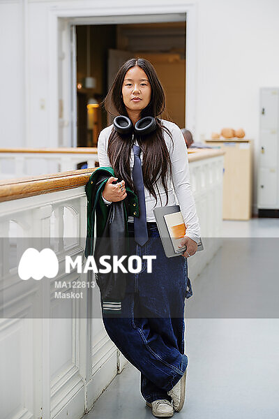 Porträtt av ung kvinna som står i skolbyggnad