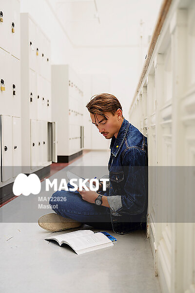 Ung man pluggar på golv i skolkorridor