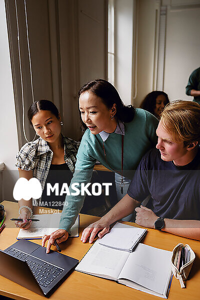 Kvinnlig professor förklarar för elever i klassrum