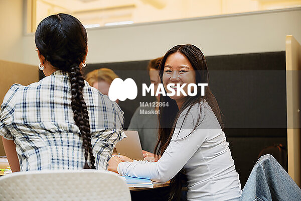 Porträtt av leende ung kvinna som sitter med vänner i skola