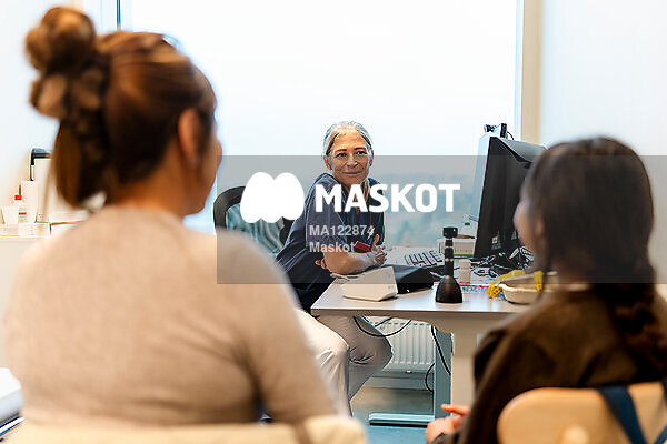 Äldre kvinnlig läkare pratar med patienter