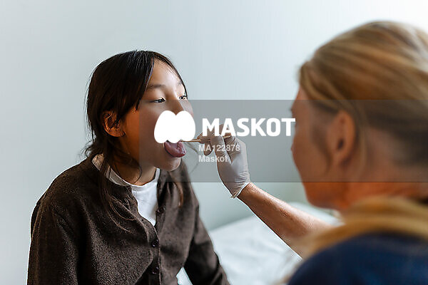 Kvinnlig läkare undersöker hals på ung flicka