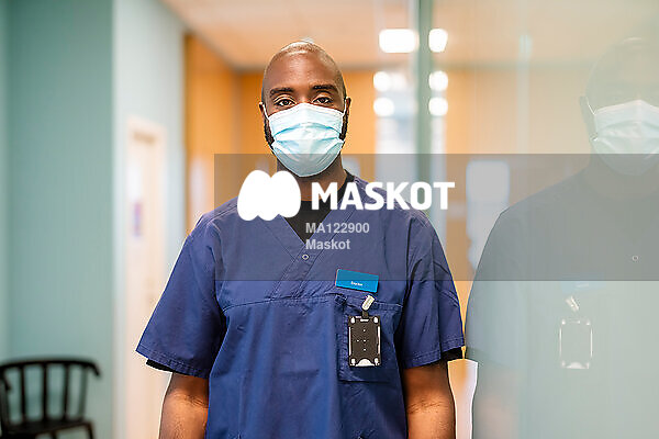 Porträtt av manlig läkare med munskydd