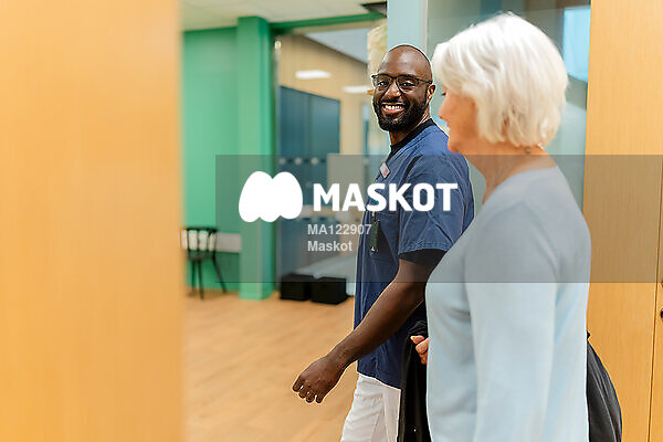 Leende manlig läkare pratar med äldre patient