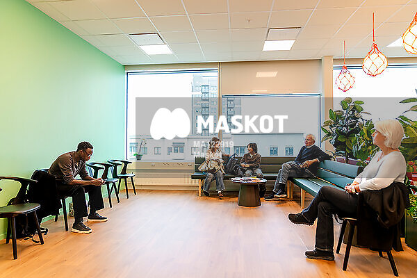 Män och kvinnor väntar i väntrum på sjukhus