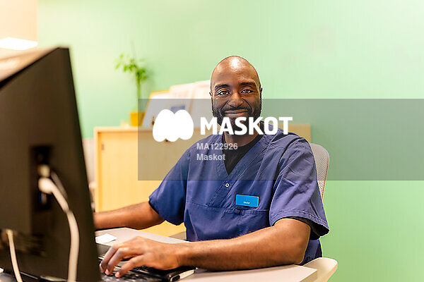 Porträtt av leende manlig läkare som sitter vid dator