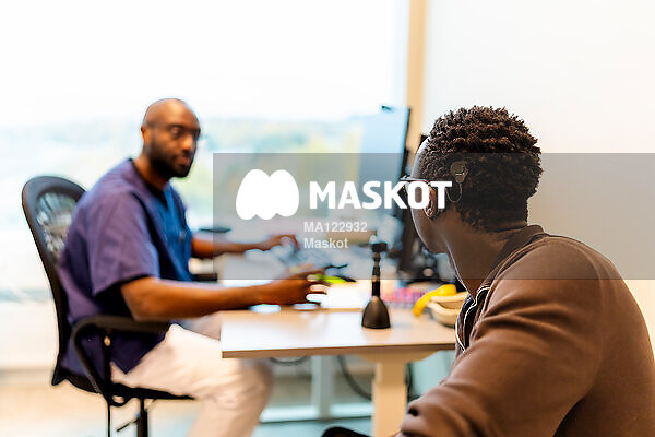 Patient med hörapparat sitter med läkare i undersökningsrum