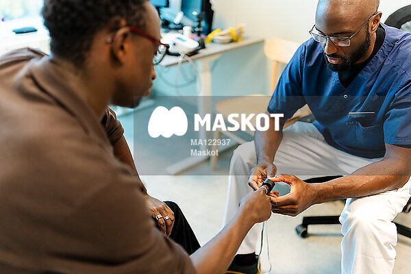 Manlig läkare mäter puls med medicinskt instrument