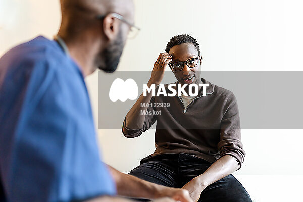 Ung manlig patient kommunicerar med läkare