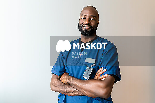Porträtt av leende manlig läkare som står med armar i kors