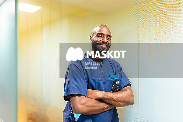 Porträtt av leende manlig läkare som står i korridor