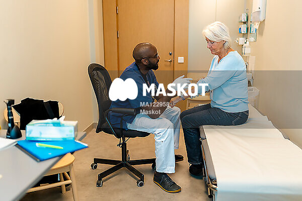 Manlig läkare undersöker äldre patient