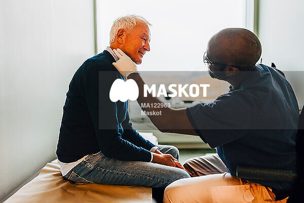 Manlig läkare undersöker hals på äldre patient