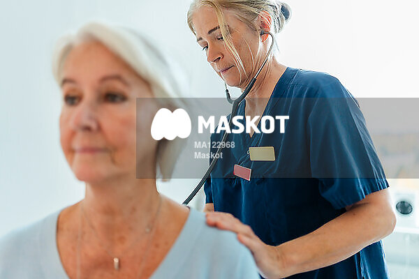 Kvinnlig läkare undersöker äldre patient med stetoskop