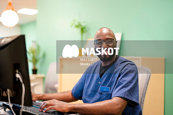 Porträtt av leende manlig läkare som sitter vid dator