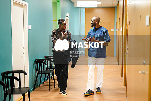 Manlig läkare pratar med patient på teckenspråk i korridor