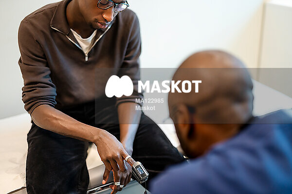Manlig läkare mäter blodtryck på patient