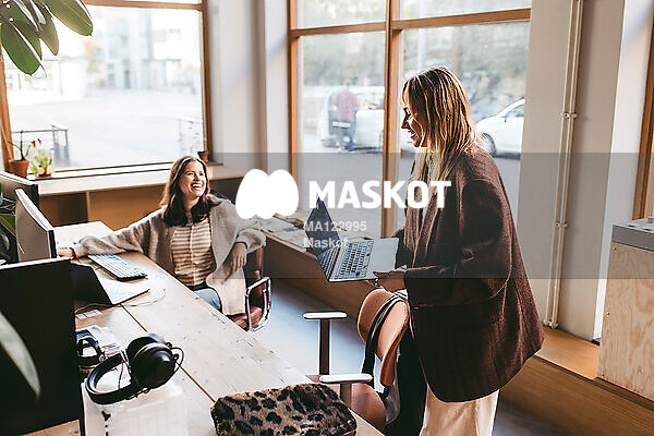 Glad kvinnlig entreprenör pratar med kollega