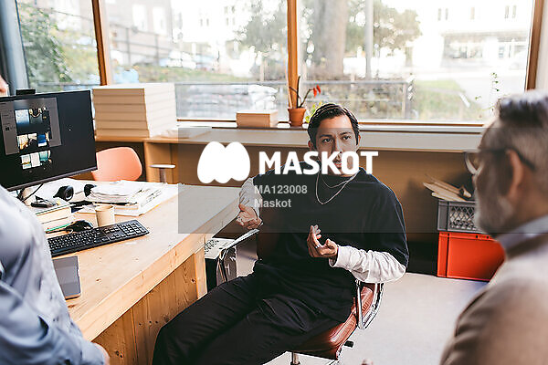 Manlig entreprenör diskuterar med kollegor