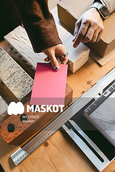 Kvinnlig arkitekt jämför färgat papper med tegelsten