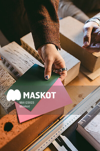 Kvinnlig arkitekt jämför färger med tegelsten