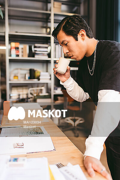 Fokuserad manlig arkitekt läser i bok på kontor