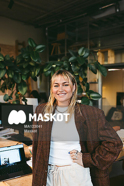Porträtt av leende kvinnlig designer som står på kontor