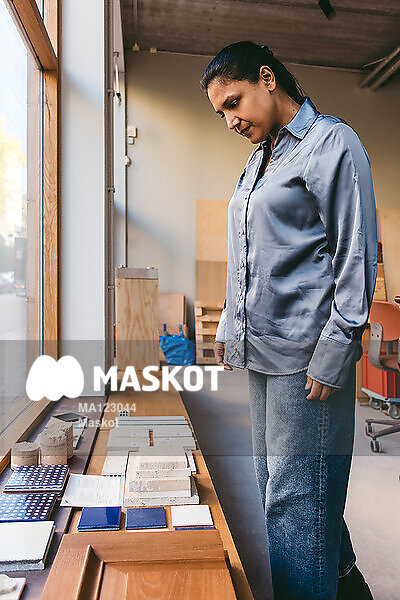Kvinnlig arkitekt inspekterar material på kontor