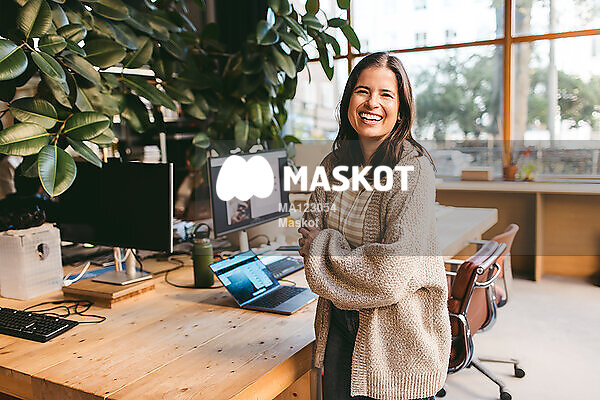 Porträtt av glad kvinnlig designer som står på kontor