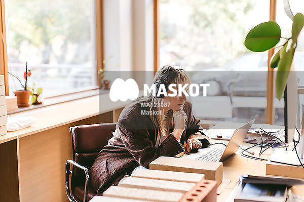 Koncentrerad kvinnlig entreprenör sitter med hörlurar på kontor