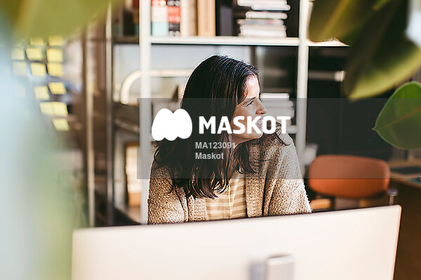 Leende kvinnlig arkitekt står på kontor