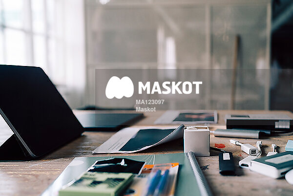 Skrivbord med surfplatta och kontorsmaterial