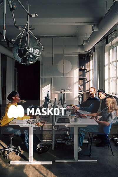 Manliga och kvinnliga kollegor sitter vid skrivbord på kontor