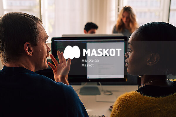 Man och kvinna diskuterar vid dator på kontor