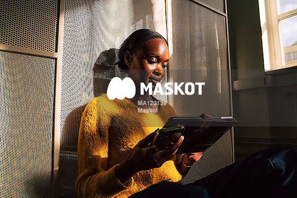 Kvinna använder surfplatta på kontor