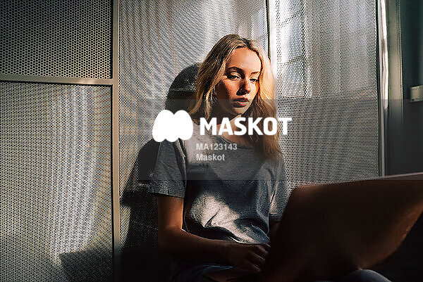 Ung kvinna sitter på golv med dator