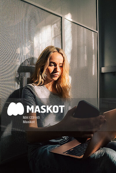 Ung kvinna sitter på golv med dator