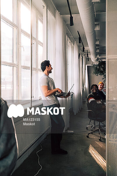 Man står med dator och pratar med kollegor