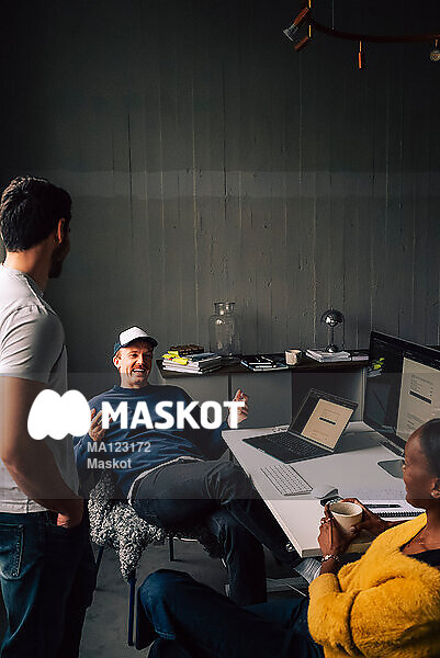 Glad ung man pratar med kollegor vid skrivbord