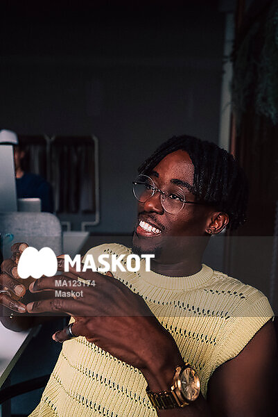 Ung man pratar pratar på jobbet
