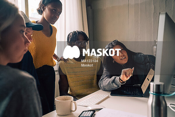 Manliga och kvinnliga kollegor kollar på skärm
