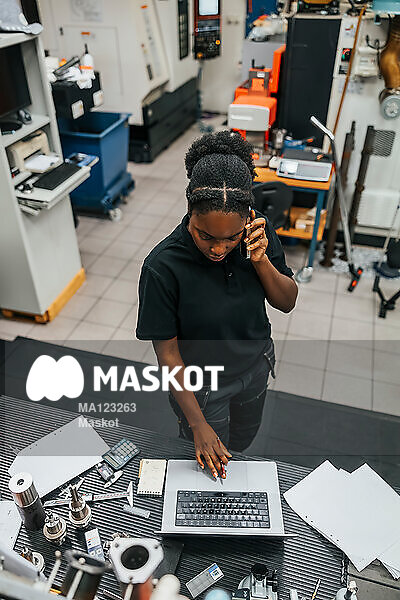 Ung kvinnlig fabriksarbetare pratar i telefon