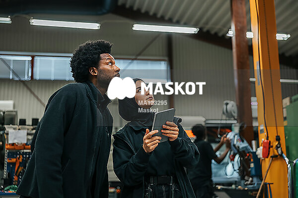 Manlig och kvinnlig fabriksarbetare diskuterar
